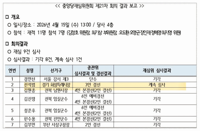결국 중앙당의 ‘계속 심사’ 결정은 화성특례시장 경선 문제가 단순 지역 분쟁을 넘어 당 차원의 리스크로 확대됐음을 보여주는 신호로 해석된다.